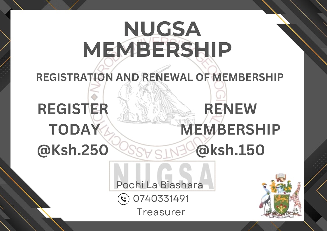 To be a Member of the University of Nairobi Geological Students Association(NUGSA) you need to pay a registration fee of Ksh.250. NUGSA Members need renew their membership every academic year at a fee of Ksh.150.